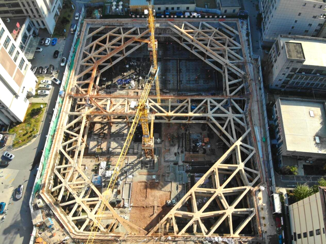 創(chuàng)新采用“旋挖樁+三層混凝土內(nèi)支撐”的復(fù)合支護(hù)體系?;悠矫娉叽邕_(dá)105.2米×81.9米,深度13.3—15.05米,設(shè)置支護(hù)樁279根、鋼立柱54根及三層混凝土內(nèi)支撐。針對雜填土區(qū)域富含地下水的情況,項目在支護(hù)樁間增設(shè)214根高壓旋噴樁,構(gòu)筑起一道可靠的截水帷幕,有效防止了基坑邊水土流失,保障了基坑穩(wěn)定與周邊建筑物安全。