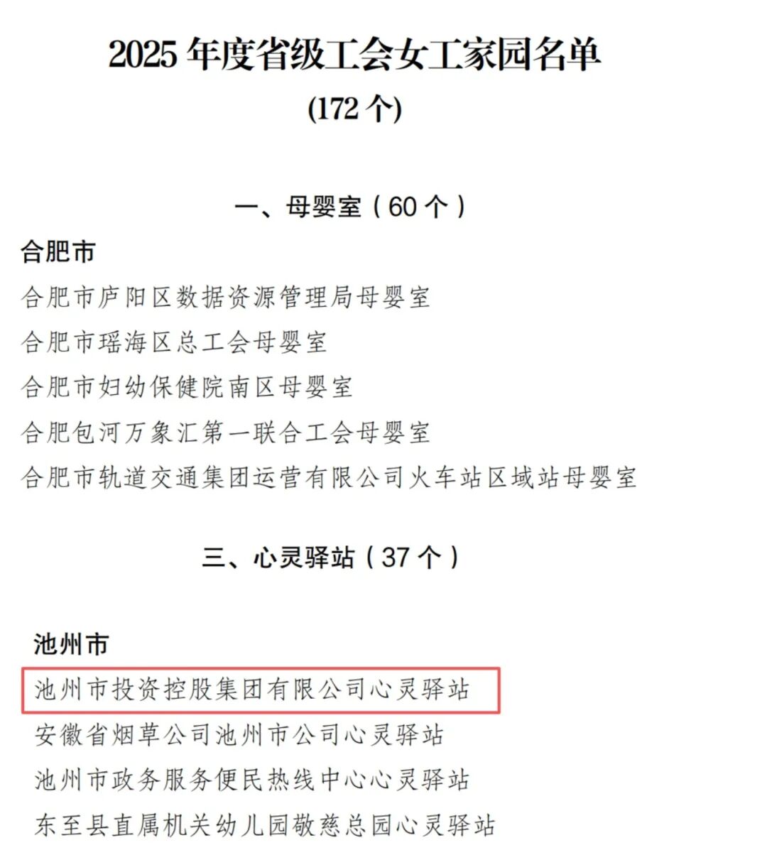 近日,安徽省總工會印發(fā)《關(guān)于公布2025年度省級工會女工家園名單的通知》,集團(tuán)工會申報的省級工會女工家園心靈驛站項目順利通過評審,成功躋身省級女職工關(guān)愛服務(wù)陣地行列,這是集團(tuán)工會深耕女職工權(quán)益保障、做實(shí)人文關(guān)懷工作的重要成果。