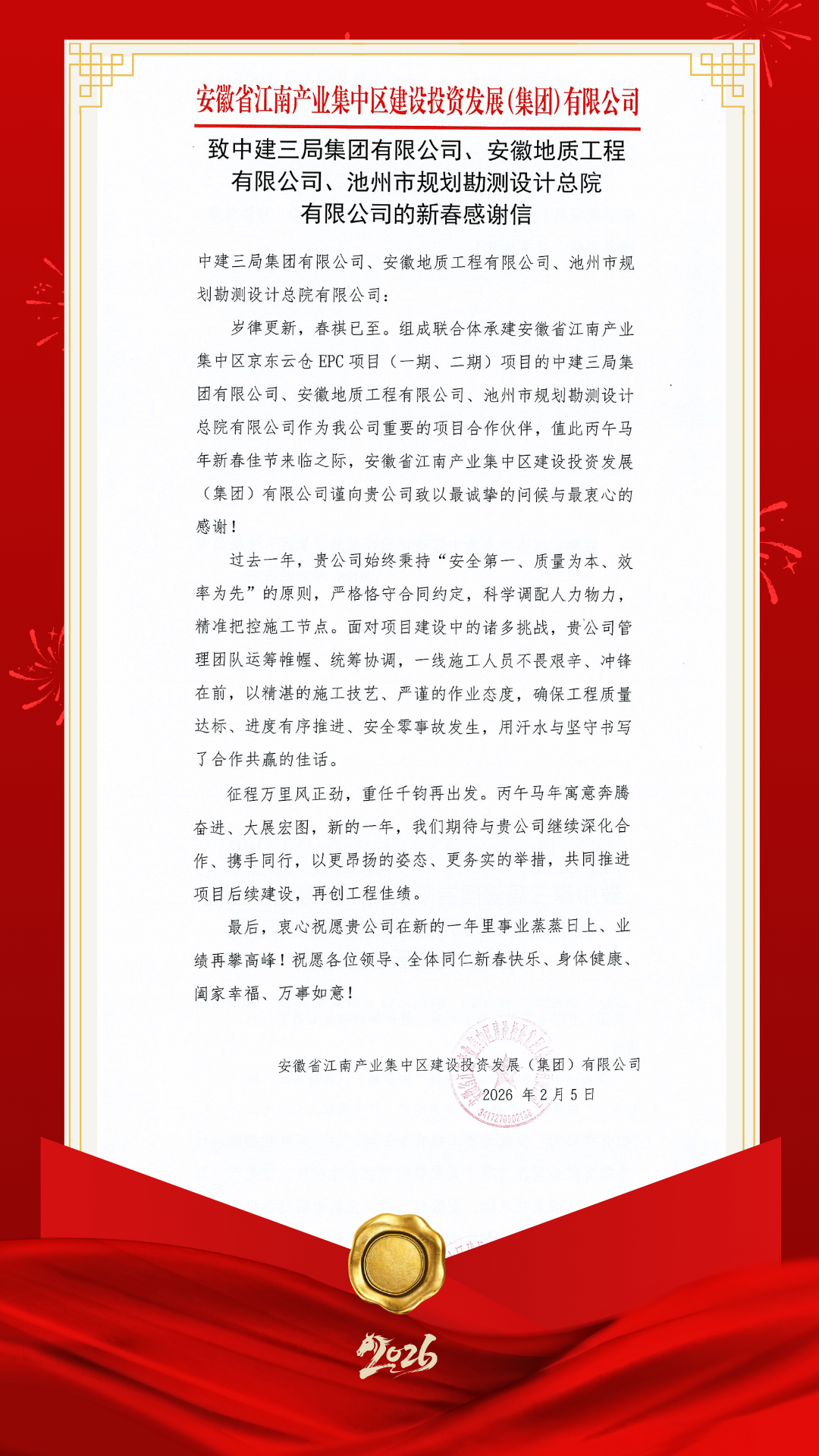 歲末傳捷報,新春啟佳音。近日,由集團旗下安徽地質(zhì)工程有限公司、池州市規(guī)劃勘測設(shè)計總院有限公司與中建三局集團有限公司組成的聯(lián)合體,在安徽省江南產(chǎn)業(yè)集中區(qū)京東云倉EPC項目(一期、二期)建設(shè)中,以“安全零事故、質(zhì)量全達標(biāo)、進度穩(wěn)推進”的優(yōu)異成績,圓滿達成年度建設(shè)目標(biāo),贏得項目業(yè)主安徽省江南產(chǎn)業(yè)集中區(qū)建設(shè)投資發(fā)展(集團)有限公司的高度認(rèn)可與新春致謝。